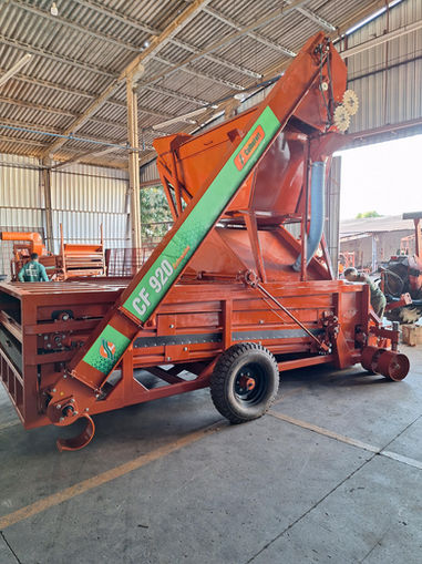 A Colheitadeira CF 920 utiliza um sistema de varreção com cabos de aço e possuiuma caçamba para a recepção de sementes a granel